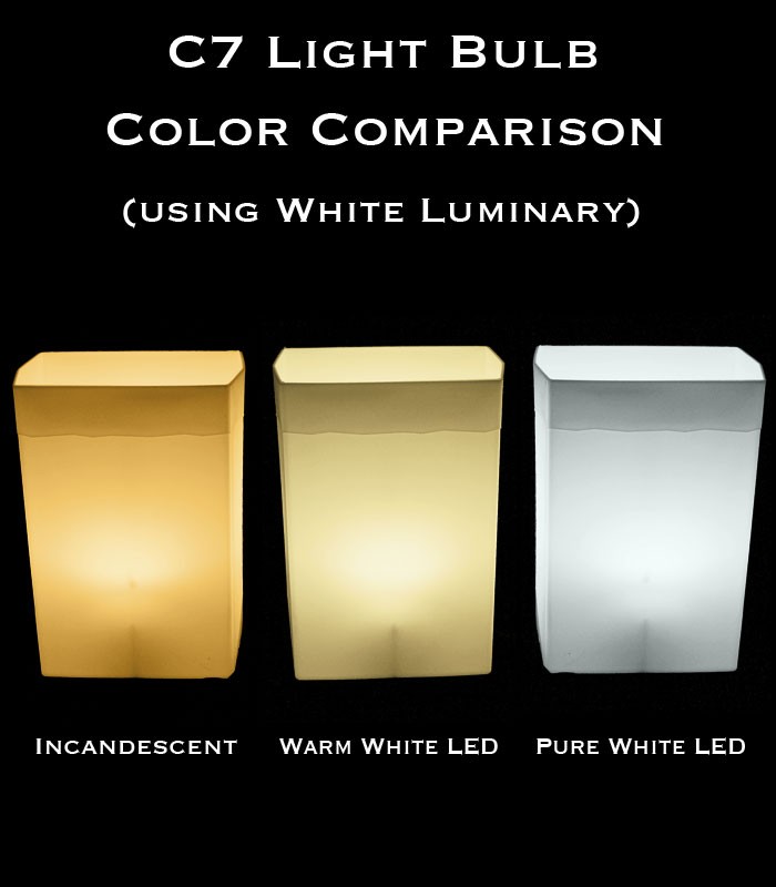These LED C7 light bulbs are the best LED C7 light bulbs offered today. Their cool white light creates a beautiful white light that is very clean in appearance. These bulbs are slightly dimmer than our standard incandescent light bulbs, but they save 8 to 10 times the electrical usage over incandescent light bulbs. Over a short period of time, they will pay for themselves.