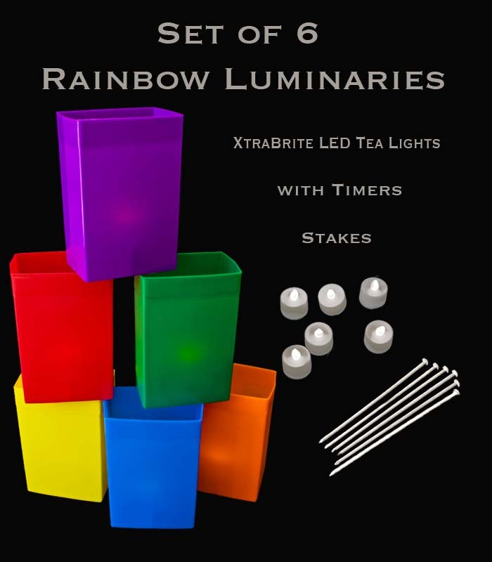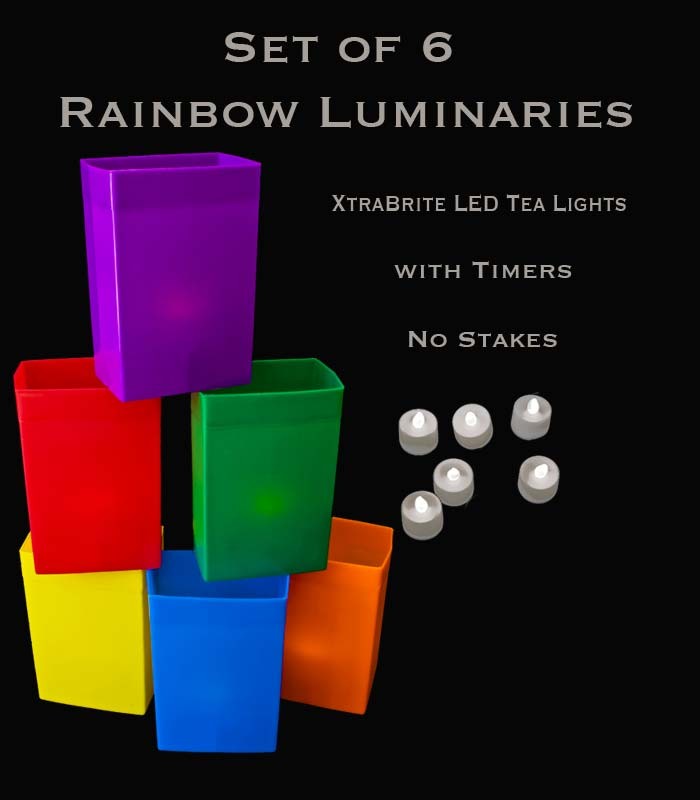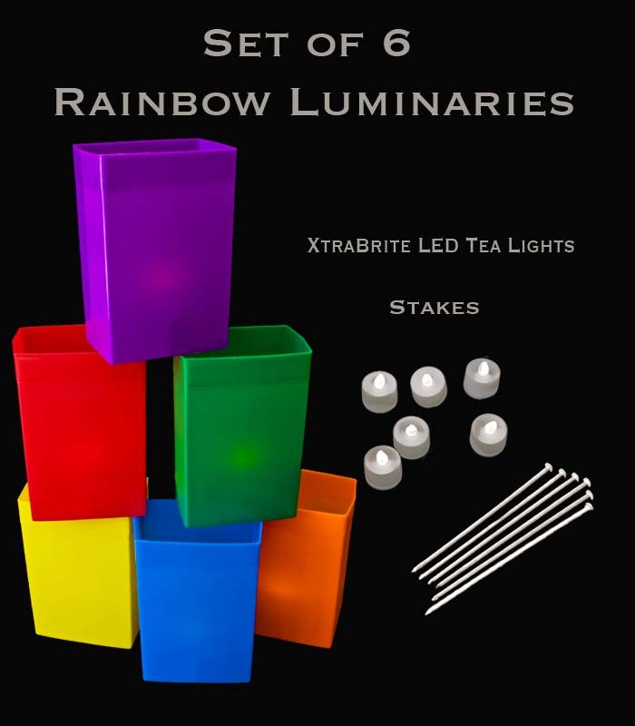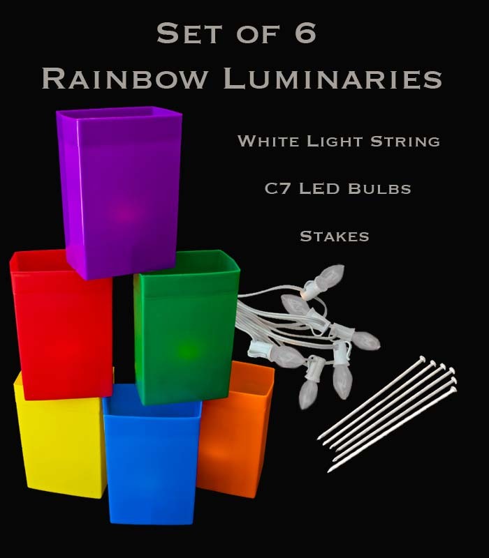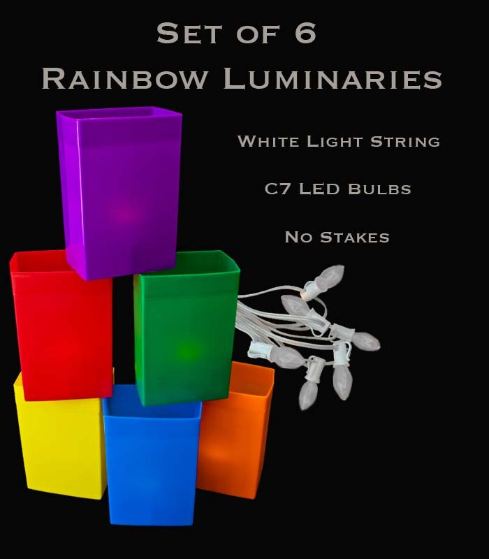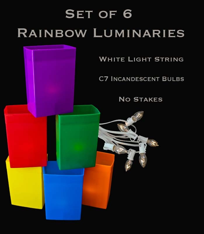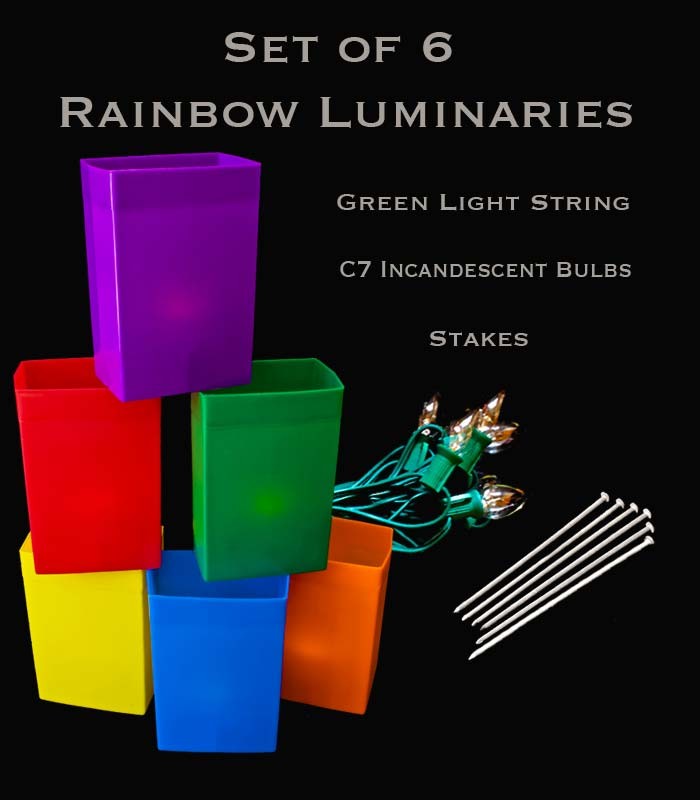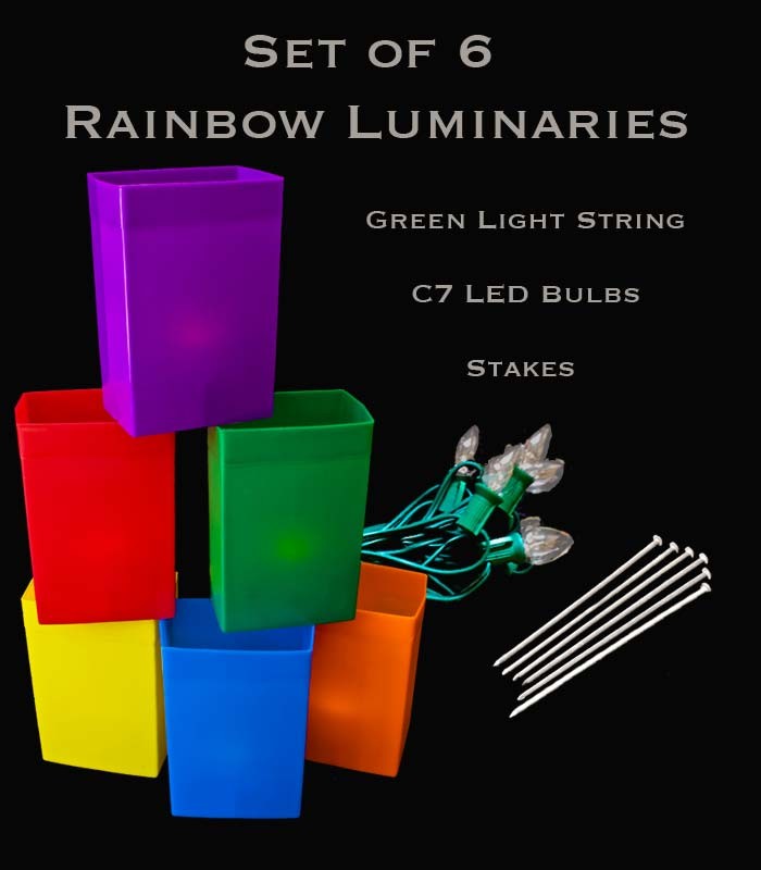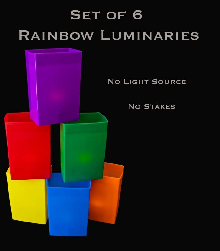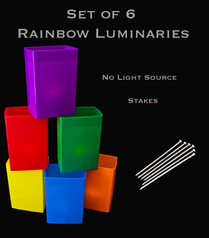 6 Rainbow (red, orange, yellow, green, blue, purple) Hard-Plastic Luminaries. Select lighting and stakes to complete your set.