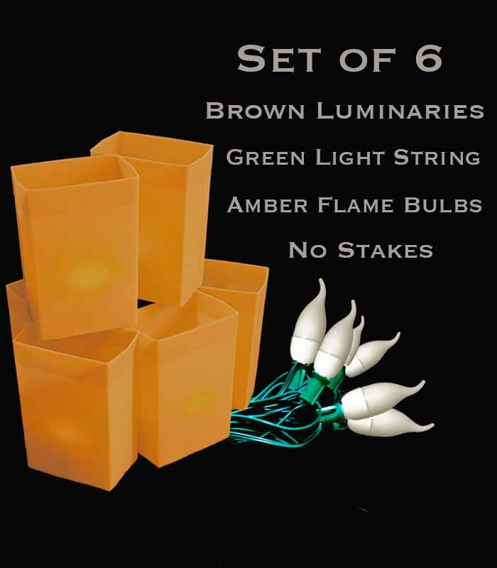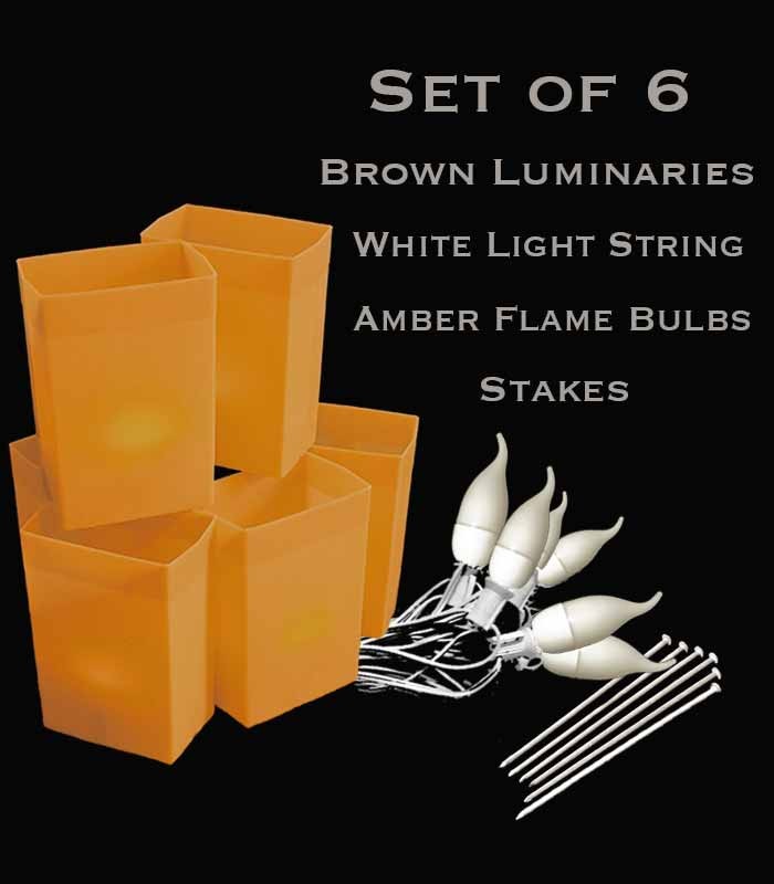 6 Brown Durable, Hard-Plastic Luminaries with flame bulbs. Select your light string color and optional stakes.