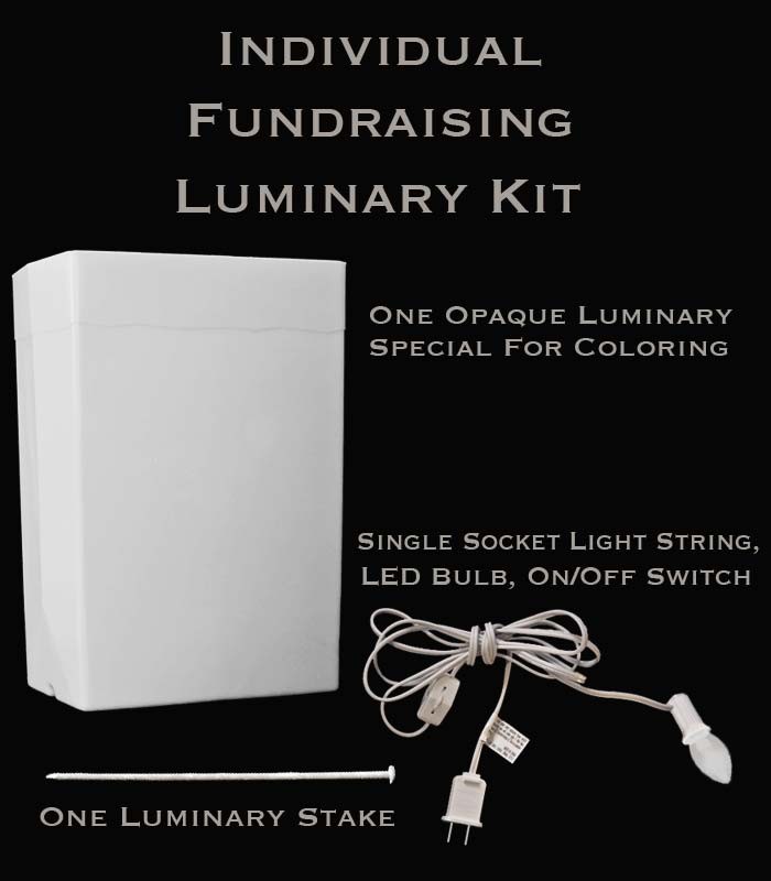 Individual fundraising Luminary Kit. Comes with one specially-manufactured luminary creating an excellent surface to apply colored markers to, a single-socket light string (on-off switch) and a warm white LED bulb.