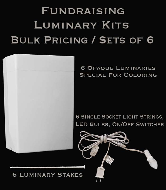 Bulk Fundraising Luminary Kits, sold in quantities of 6. Each kit comes with one specially-manufactured luminary creating an excellent surface to apply colored markers to, a single-socket light string (on-off switch) and warm white LED bulb.