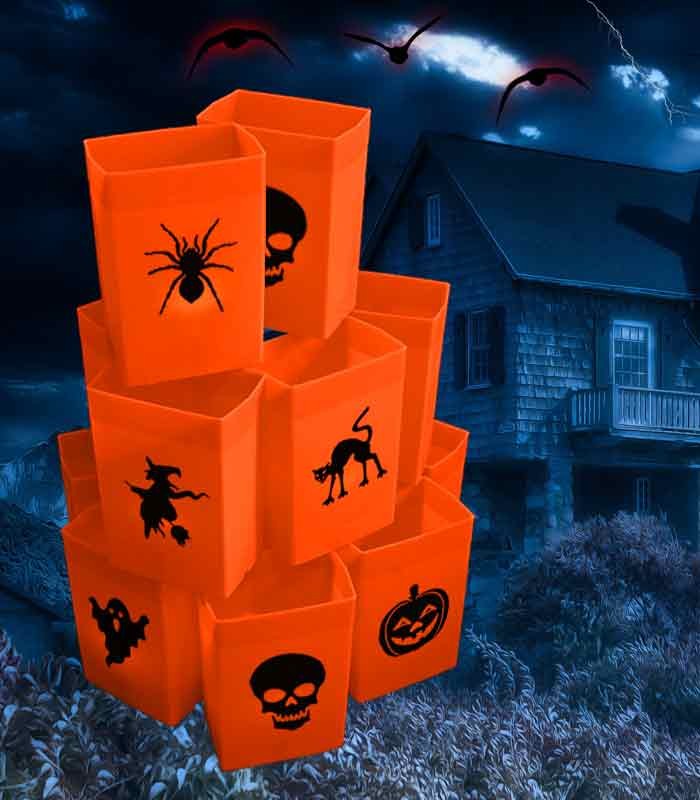 Our Set of 12 Orange Halloween Luminaries come already decorated, with 6 unique designs (used twice per set). Designs include: Ghost, Cat, Witch, Pumpkin, Spider and Skull. See all 6 designs by browsing the photos above.