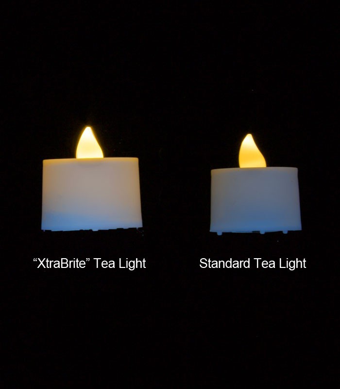 This LED "XtraBrite" Amber Tea Candle Light is a flameless, waxless, heatless, long-lasting flickering candle. 50% brighter than standard tea lights. It uses the larger CR2450 battery and has 2 1/2 times the capacity over the CR2032 used in standard tea lights, lasting twice as long.