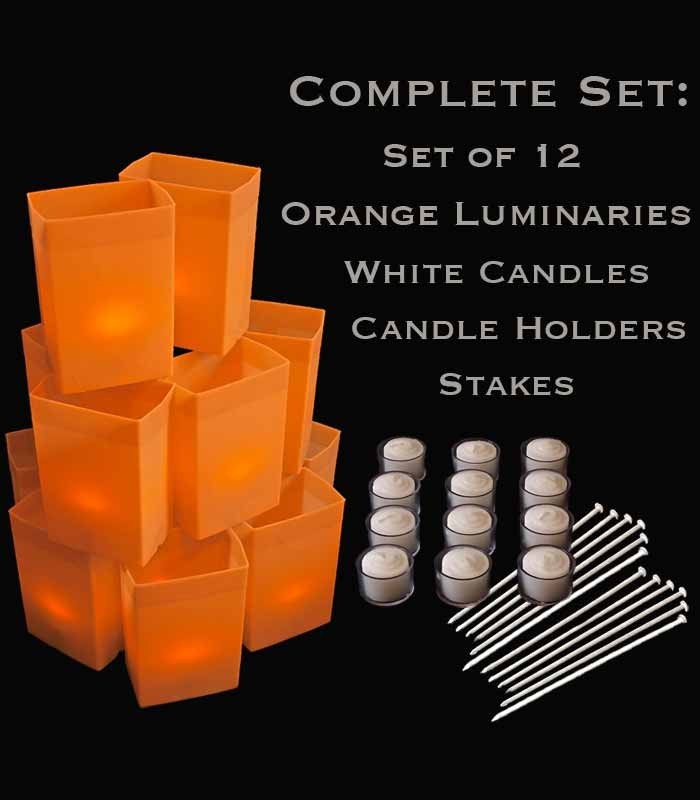 Complete Set of 12 Orange Solid, Hard-Plastic Luminaries. Includes choice of candles, holders and stakes.
