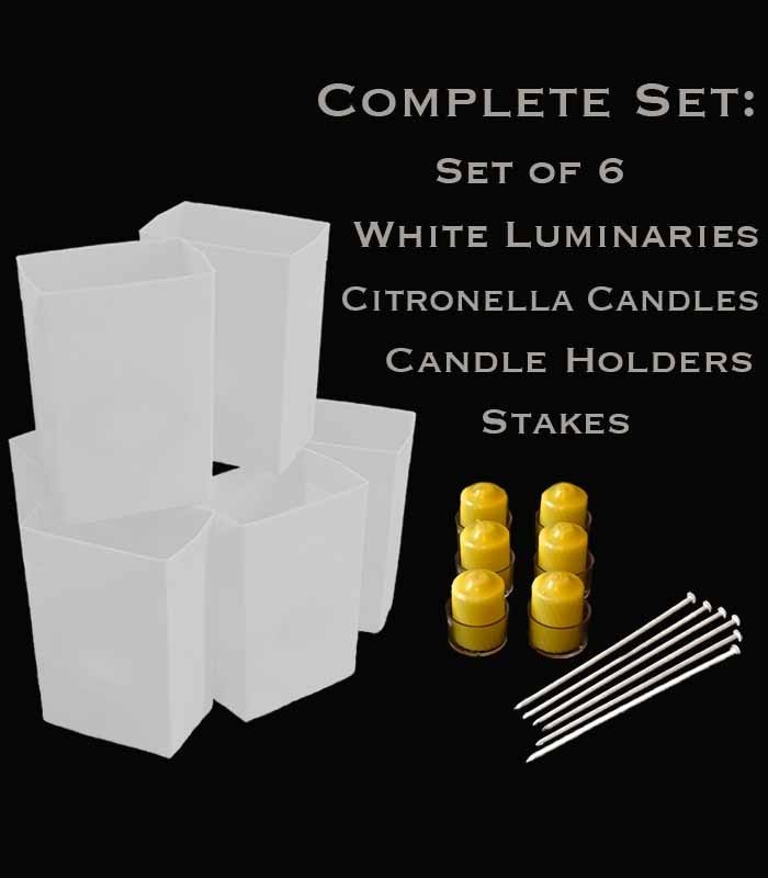 Complete Set of 6 White Solid, Hard-Plastic Luminaries. Includes choice of candles, holders and stakes.