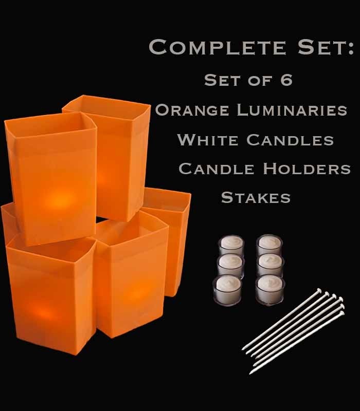 Complete Set of 6 Orange Solid, Hard-Plastic Luminaries. Includes choice of candles, holders and stakes.