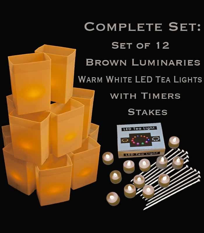 Complete Set of 12 Brown Solid, Hard-Plastic Luminaries. Includes choice of LED tea light color (w/timers) and stakes.