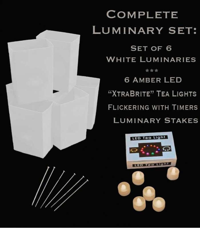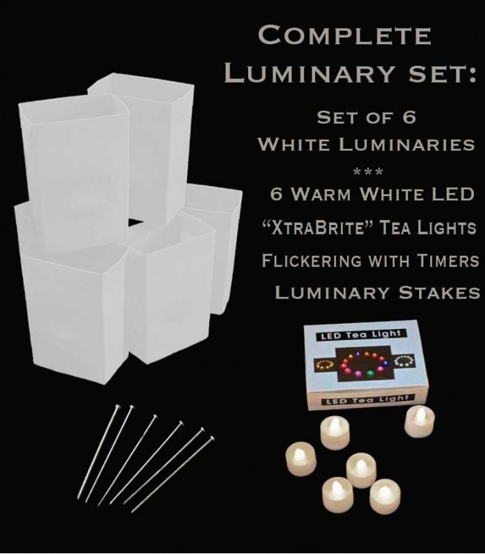 Complete Set of 6 White Solid, Hard-Plastic Luminaries. Includes choice of "XtraBrite" LED tea light color (w/timers) and stakes.