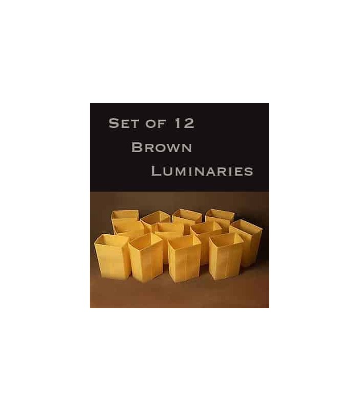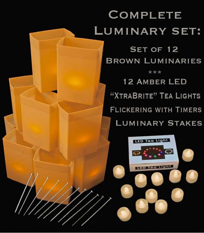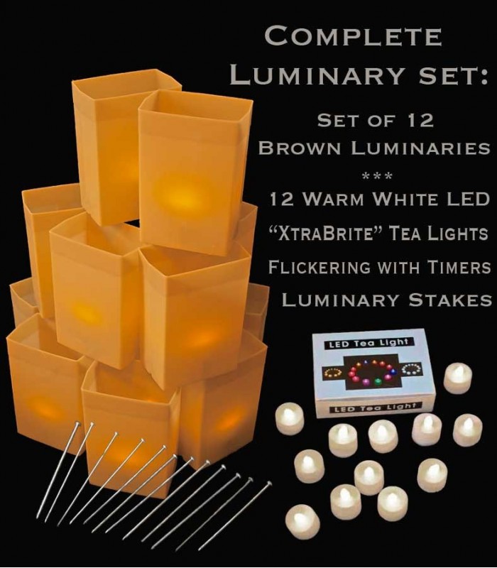 Complete Set of 12 Brown Solid, Hard-Plastic Luminaries. Includes choice of "XtraBrite" LED tea light color (w/timers) and stakes.