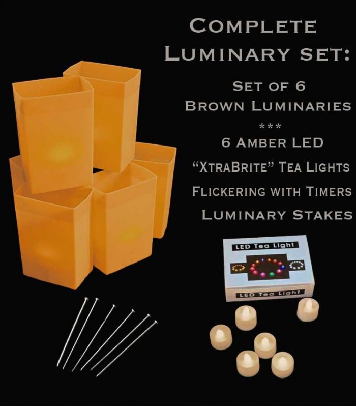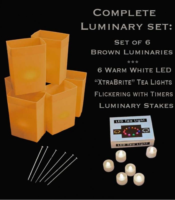 Our traditional brown luminaries have always been a favorite choice by homeowners in the Southwest. These luminaries also closely resemble typical brown paper sacks that were originally used for luminaries. Many customers compliment the rich, earthy tones of these luminaries. Other obvious uses for brown luminaries include Christmas and other holidays, birthdays and weddings, country and traditional themed events, and really every use you can think of for our white luminaries!