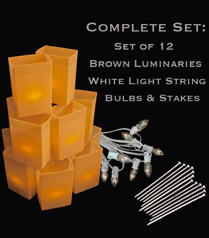 Set of 12 Brown Luminaries, Light String, Clear Bulbs & Stakes