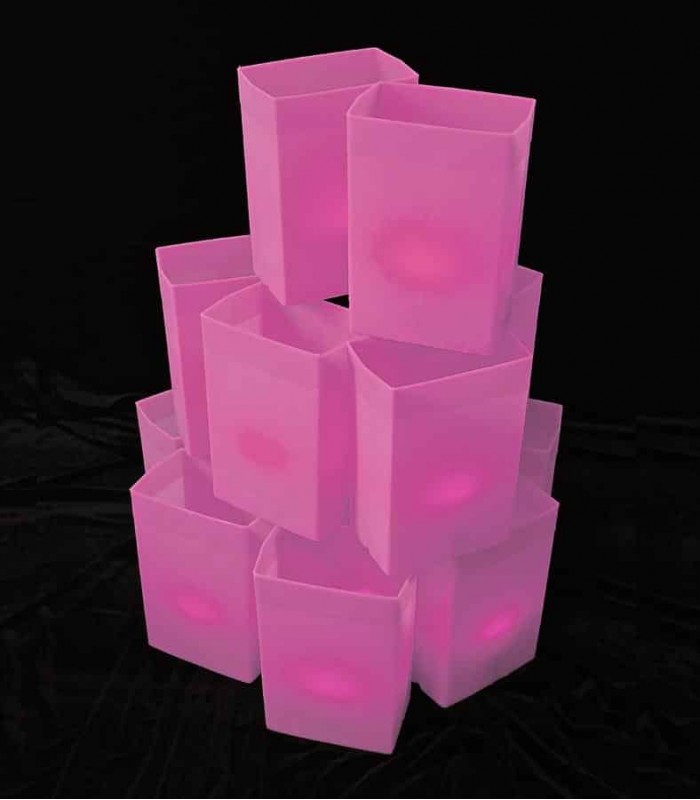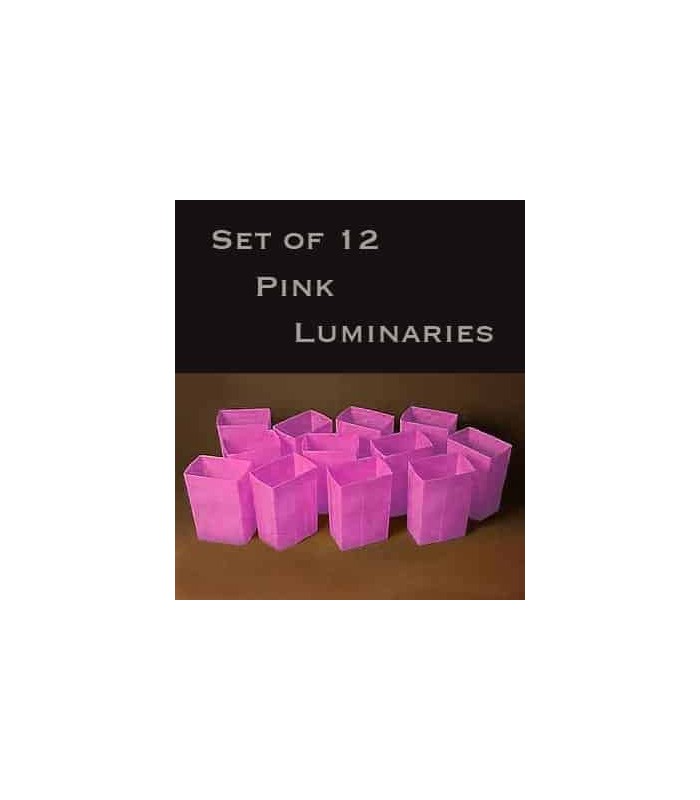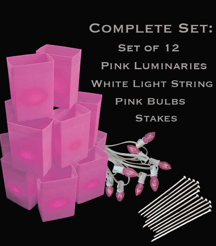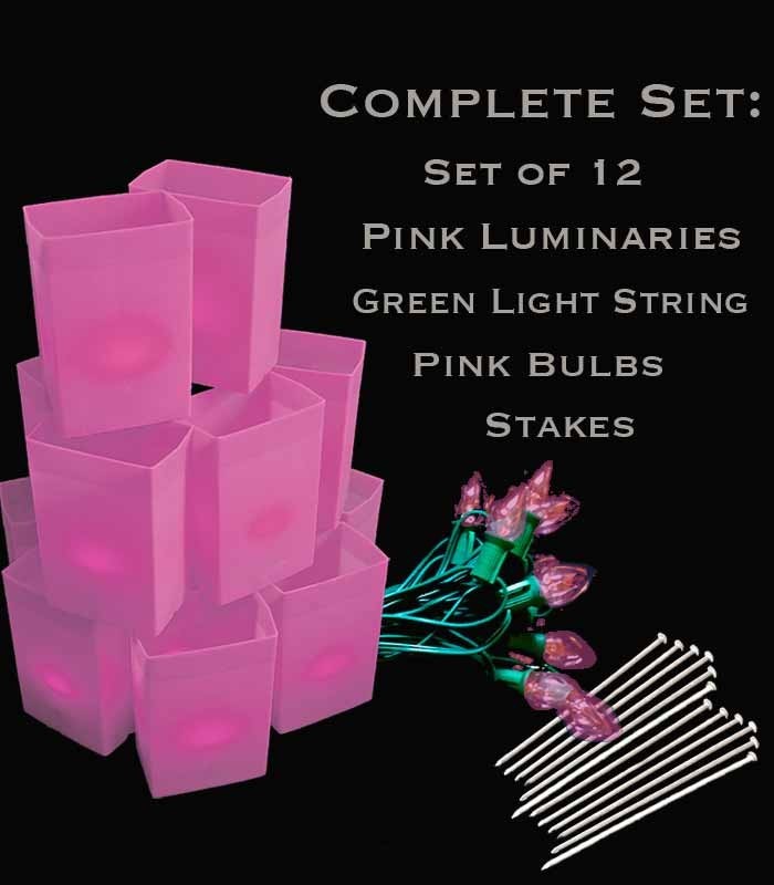 Complete Set of 12 Pink Solid, Hard-Plastic Luminaries. Includes choice of light string color, pink bulbs and stakes.