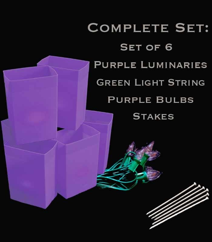Complete Set of 6 Purple Solid, Hard-Plastic Luminaries. Includes choice of light string color, purple bulbs and stakes.
