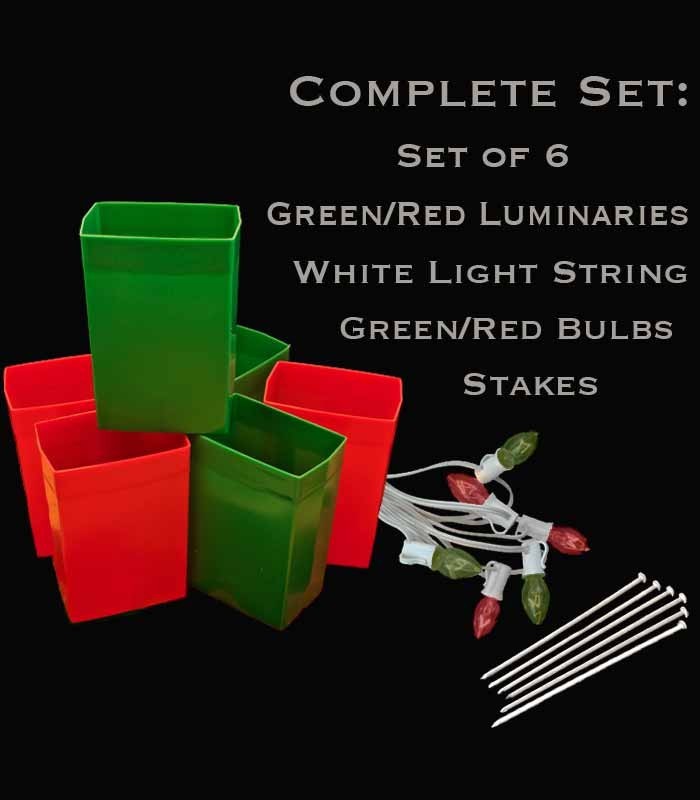 Complete Set of 6 Red/Green Solid, Hard-Plastic Luminaries. Includes choice of light string color, red and green bulbs and stakes.