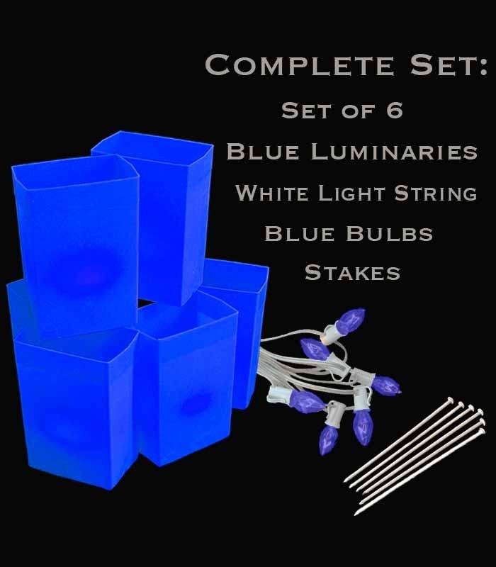 Complete Set of 6 Blue Solid, Hard-Plastic Luminaries. Includes choice of light string color, bulbs and stakes.