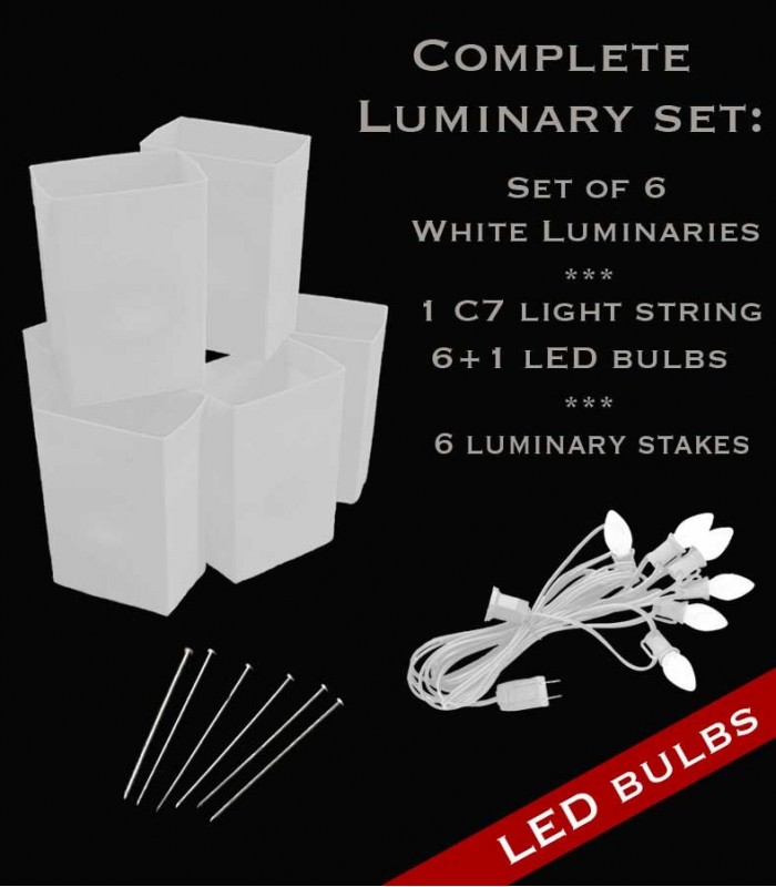 Complete Set of 6 White Solid, Hard-Plastic Luminaries. Includes choice of light string color, LED bulbs and stakes.