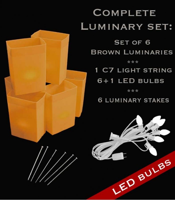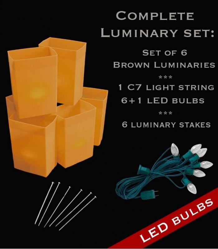 Set of 6 Brown Luminaries, Light String, LED Bulbs & Stakes