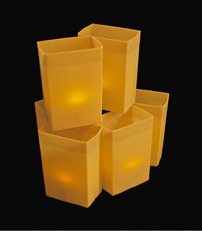 3. LED Tealights with Timers - Our second most-popular light source. 6 individual tealights to match set of 6 luminaries. No more having to turn your tea lights on an off every evening! Simply turn them on once (at the time you want them to come on every evening) and they will stay on for 5 hours and then will automatically shut off for 19 hours. It will continue this same timing sequence every following evening. All you have to do is turn them on once! PROS: Nice flickering light mimics candles. No fire hazard. No electric cords involved. Batteries last approximately 35 hours. CONS: Less brightness than electric light strings. Amber is the usual tea light color, making the brown luminaries emit a warm color.