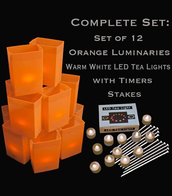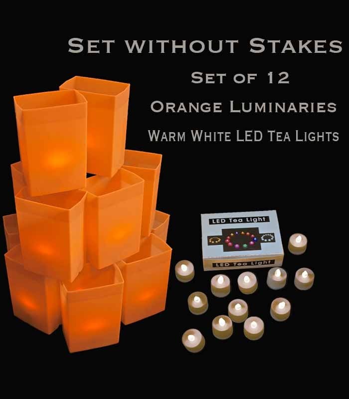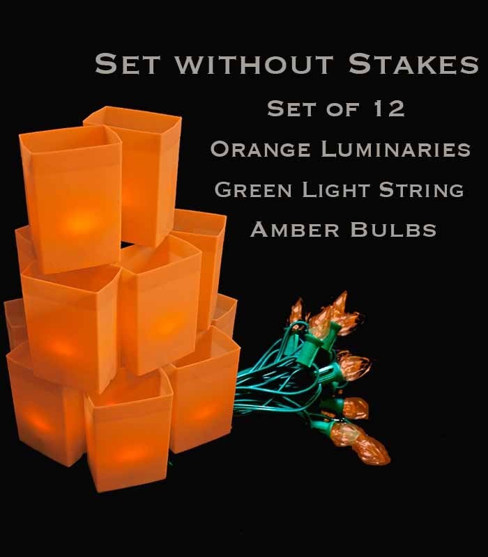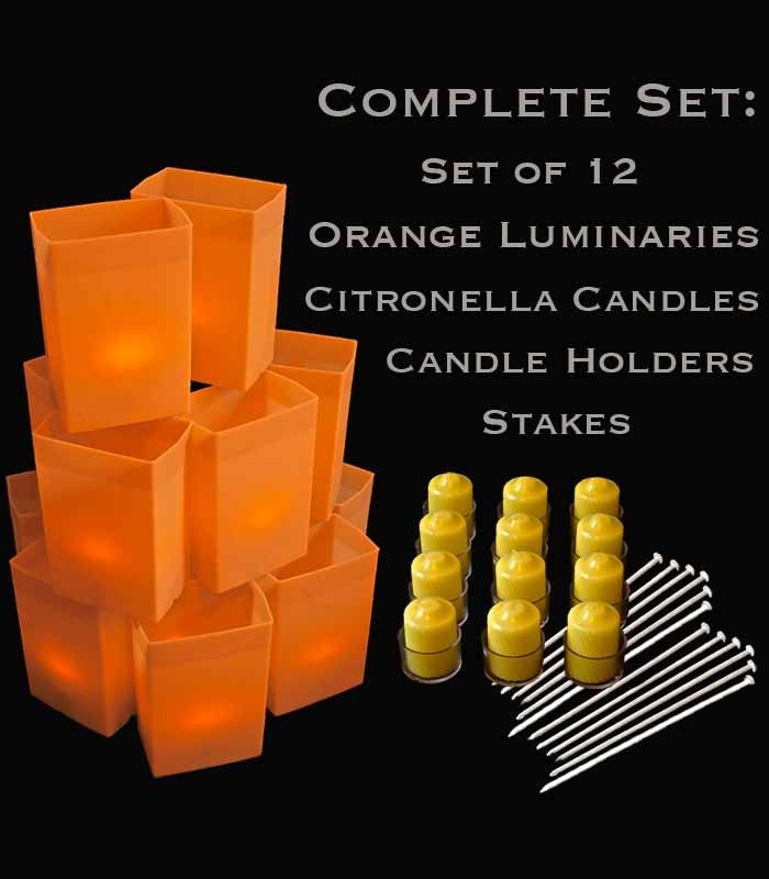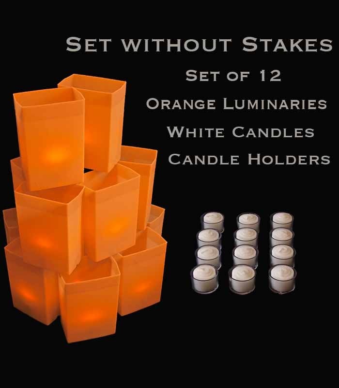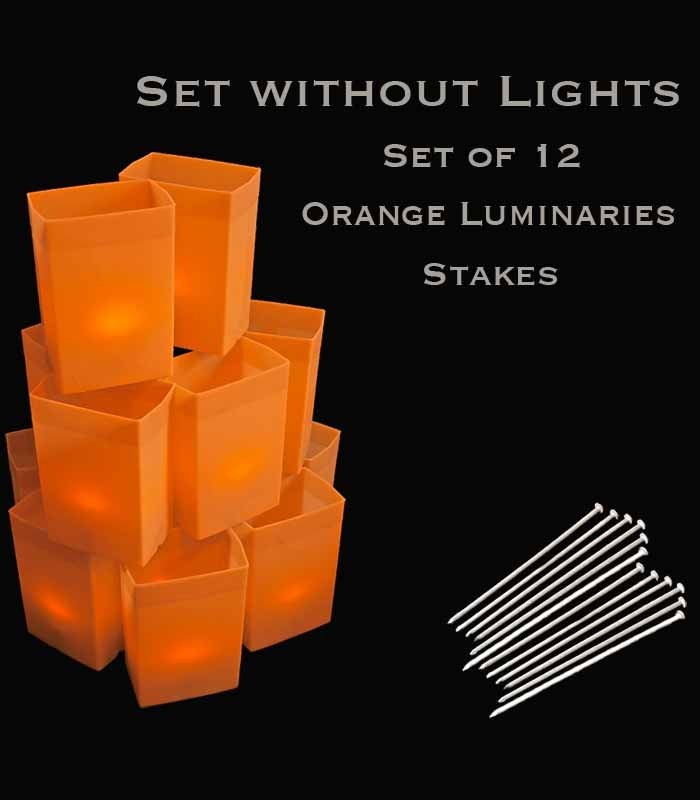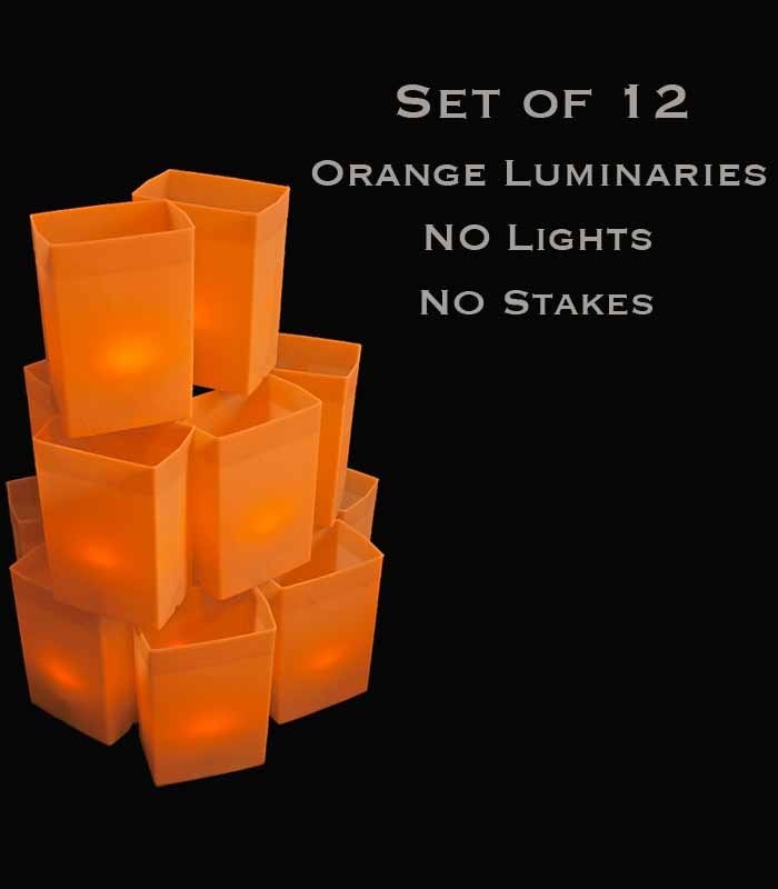 12 Orange Solid, Hard-Plastic Luminaries. Select your lighting source to complete your set.