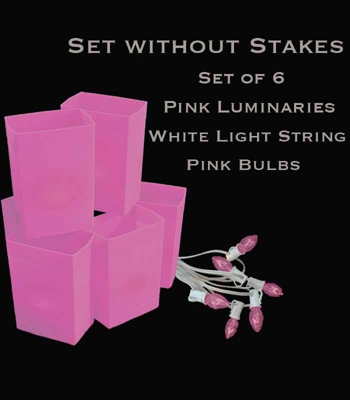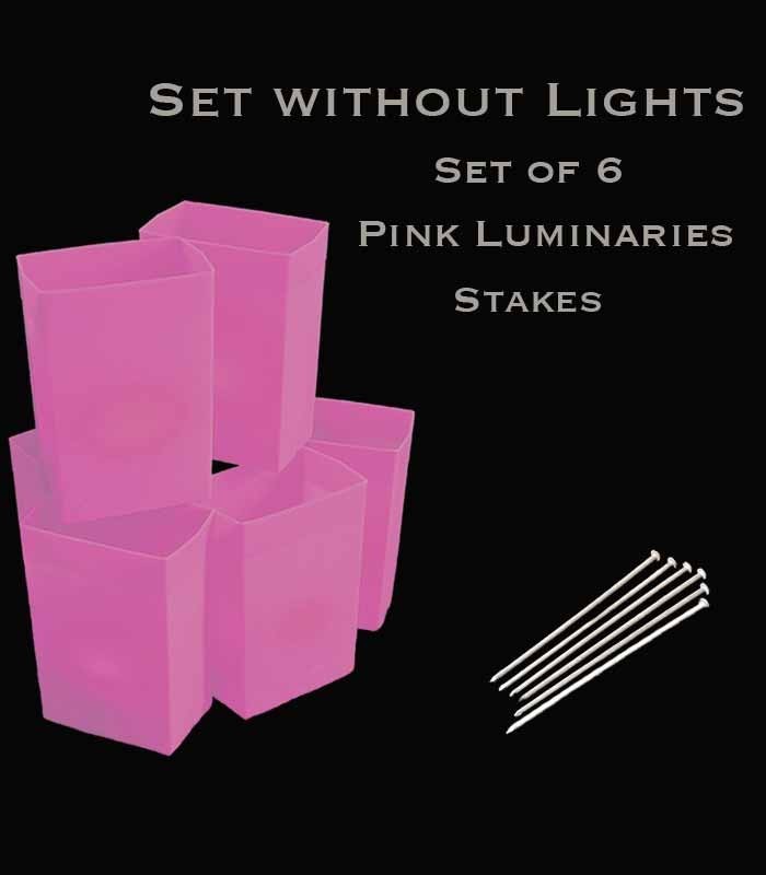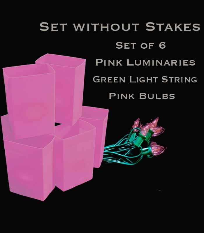 1. No Light Source - Our luminarias are designed for general use. If you have your own light source you can use them with our luminaries but please be aware that these pink luminaries require a very bright light source and the color of the light source will decide the quality of light given off. It is advised to match your luminaries with our pink bulbs and light strings.