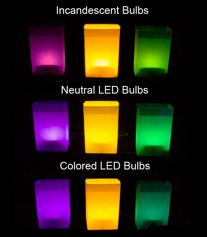 Electric Light Strings - Our most-popular light source. Strings available in green color, and with incandescent, white LED bulbs, or colored LED bulbs. 12-socket light strings with 36-inches between sockets, 36-feet in total length. Comes with an extra bulb of each kind used. Requires 110-volt outlet nearby. Examine the comparison of light bulb choices above in the photos. The incandescent bulbs are brightest. The white LED bulbs are the best balanced light and still bright. The colored LED bulbs are less bright but have very rich color saturation! The photo above is not very accurate how they really look. The description here is your best guide.