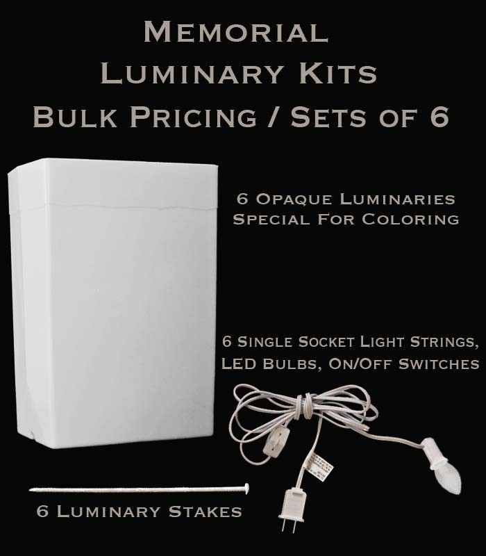 Bulk Memorial Luminaria Kits, sold in quantities of 6. Each kit comes with one specially-manufactured luminary creating an excellent surface to apply colored markers to, a single-socket light string (on-off switch), warm white LED bulb, and stake.
