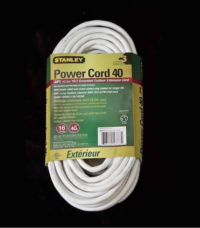 The Stanley Power Cord 40 is a 16-guage, 40-foot outdoor extension cord (white). This UL-listed cord is rated for 125VAC/13A/1625W and has strain relief and nickel-plated plug blades for longer life.