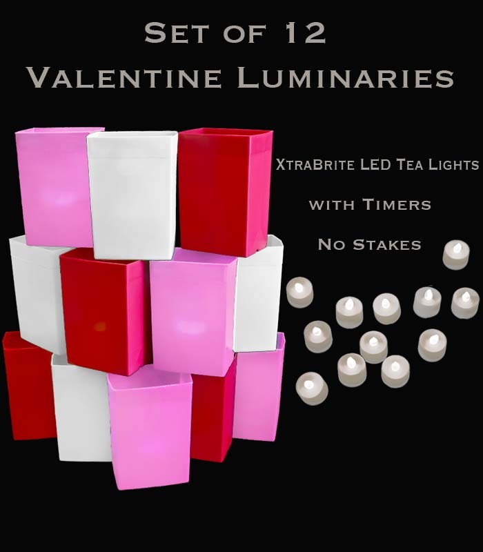 3. LED Tealights with or without Timers - Our second most-popular light source. 12 individual tealights to match set of 12 luminaries. No more having to turn your tea lights on an off every evening! Simply turn them on once (at the time you want them to come on every evening) and they will stay on for 5 hours and then will automatically shut off for 19 hours. It will continue this same timing sequence every following evening. All you have to do is turn them on once! PROS: Nice flickering light mimics candles. No fire hazard. No electric cords involved. Batteries last approximately 35 hours. CONS: Less brightness than electric light strings. Warm White is the usual tea light color for this set.