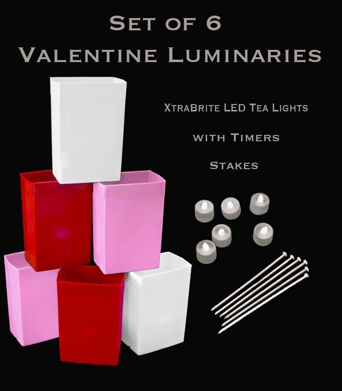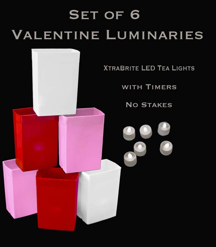 3. XtraBrite LED Tealights with or without Timers - Our second most-popular light source. 12 individual tealights to match set of 12 luminaries. No more having to turn your tea lights on an off every evening! Simply turn them on once (at the time you want them to come on every evening) and they will stay on for 5 hours and then will automatically shut off for 19 hours. It will continue this same timing sequence every following evening. All you have to do is turn them on once! PROS: Nice flickering light mimics candles. No fire hazard. No electric cords involved. Batteries last approximately 35 hours. CONS: Less brightness than electric light strings. Warm White is the usual tea light color for this set.